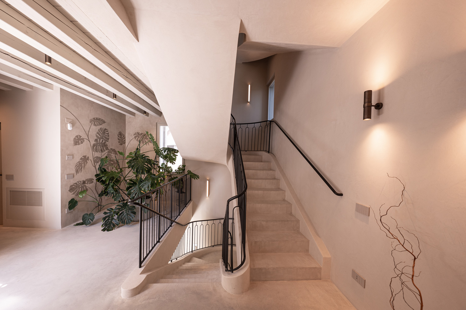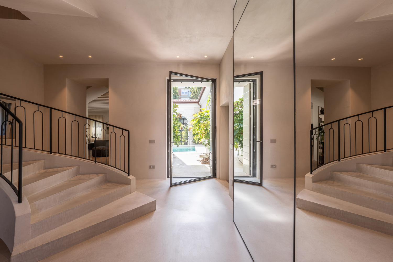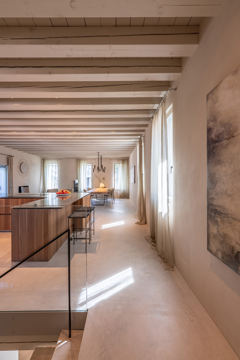 Afin d’unifier les différentes unités, Nuvolato Architop® a été choisi pour les sols et l’escalier central. Cette solution cimentaire Ideal Work, au charme industriel, conserve la robustesse du béton sur une épaisseur minimale (3–4 mm), tout en offrant une plus grande finesse esthétique. Dans le contexte du Palazzo Tezzone, elle contribue à une expression contemporaine affirmée tout en maintenant une neutralité qui dialogue harmonieusement avec les éléments historiques de la demeure. C’est également une solution idéale pour les projets de rénovation, puisqu’elle permet de renouveler les sols intérieurs et extérieurs sans démolition, y compris en présence de chauffage au sol.