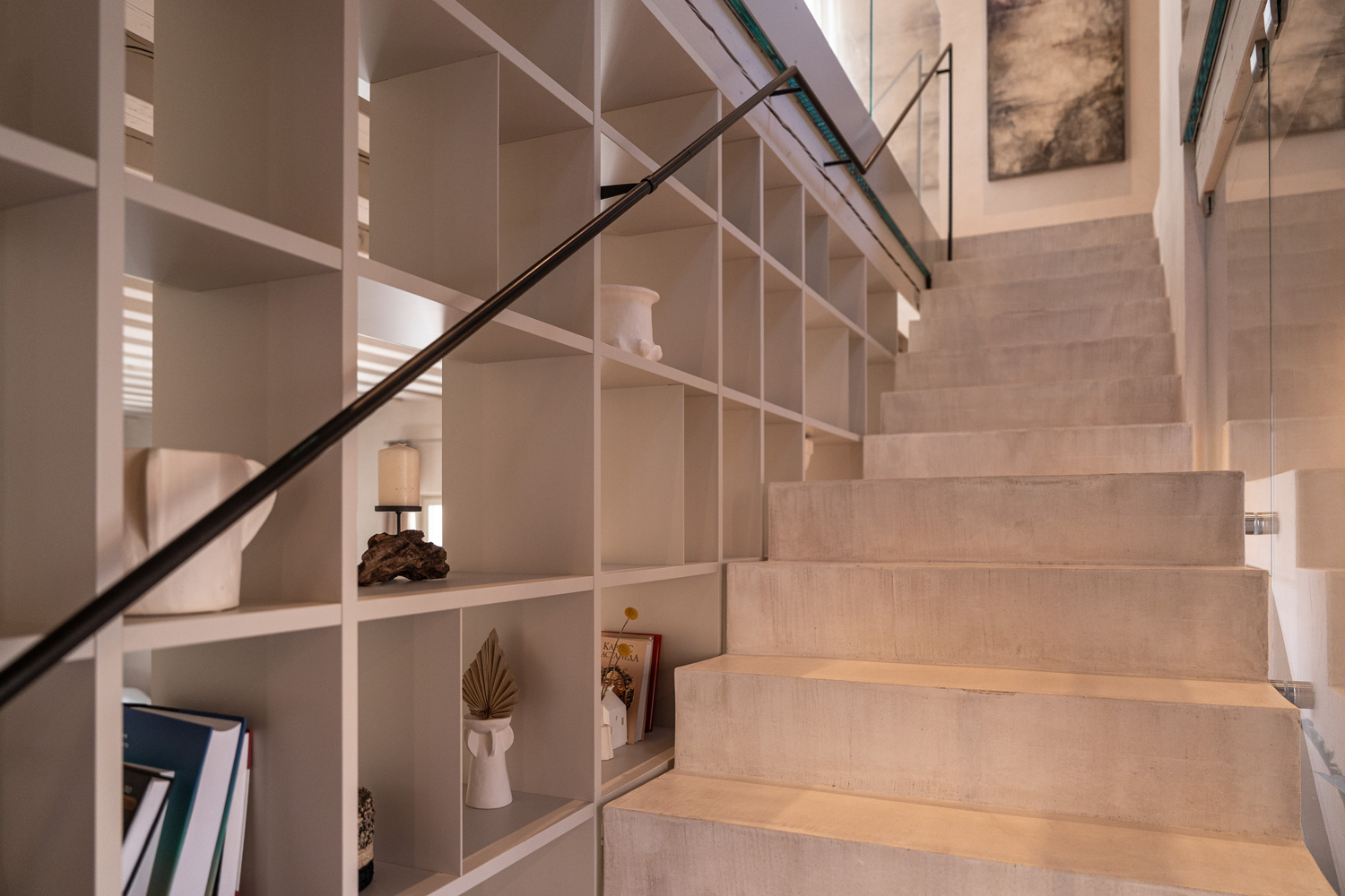 À l’intérieur, le bâtiment s’organise en trois unités d’habitation autour d’un cœur central : la cour, conçue comme un petit jardin secret avec piscine, protégée et encadrée par la végétation environnante. L’escalier relie les niveaux avec fluidité, générant des perspectives changeantes et révélant le palais comme un organisme unitaire. Les intérieurs reflètent pleinement ces intentions : les pièces sont connectées, ouvertes et légères, définies par un nombre restreint d’éléments soigneusement sélectionnés et harmonieusement intégrés. La palette chromatique est volontairement limitée, composée de tons clairs et neutres qui captent et diffusent la lumière dans l’espace. La cuisine, réalisée en bois et en métal, joue un rôle central et apporte une touche industrielle à l’ensemble.