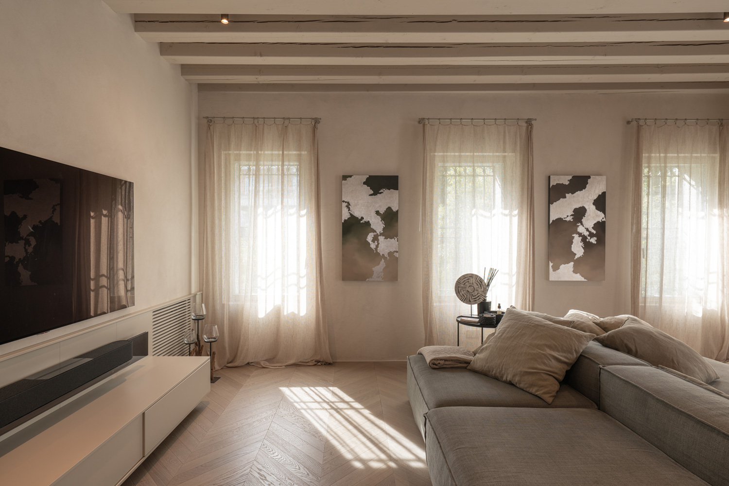 La lumière, la continuité spatiale et le dialogue avec le paysage sont les éléments qui ont guidé la rénovation du Palazzo Tezzone conçue par MMP Studio à Tréviso. Des matériaux essentiels et des tonalités neutres s’associent à la continuité de Nuvolato Architop®, contribuant à la fluidité entre les espaces.